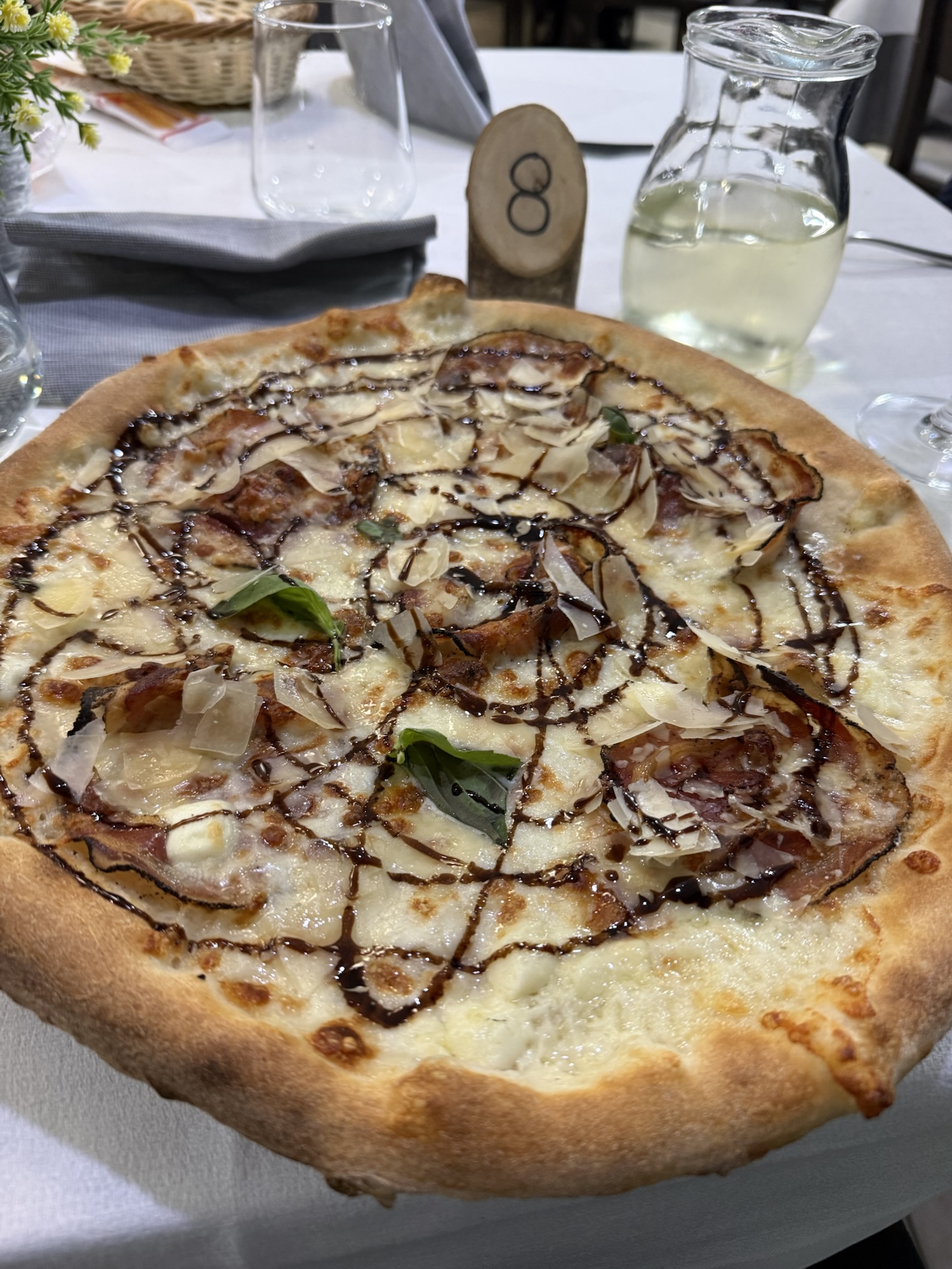 Die Pizzeria vom letzten Mal finden wir nicht mehr, aber eine Alternative ist schnell ausgemacht. Wir geraten in einen Karaoke Abend. Mit über 90 dB trällert Frau Medici italienische Gassenhauer und spendiert eine Runde Ostereier. Die Pizza ist – anders als die Gesangsqualität – hervorragend und über jeden Zweifel erhaben.